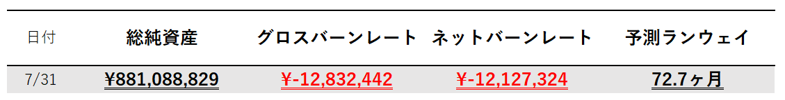 ・予測ランウェイ:総純資産/ネットバーンレートで算出。現在のキャッシュフローで純資産が何ヶ月持つかどうかを示す。