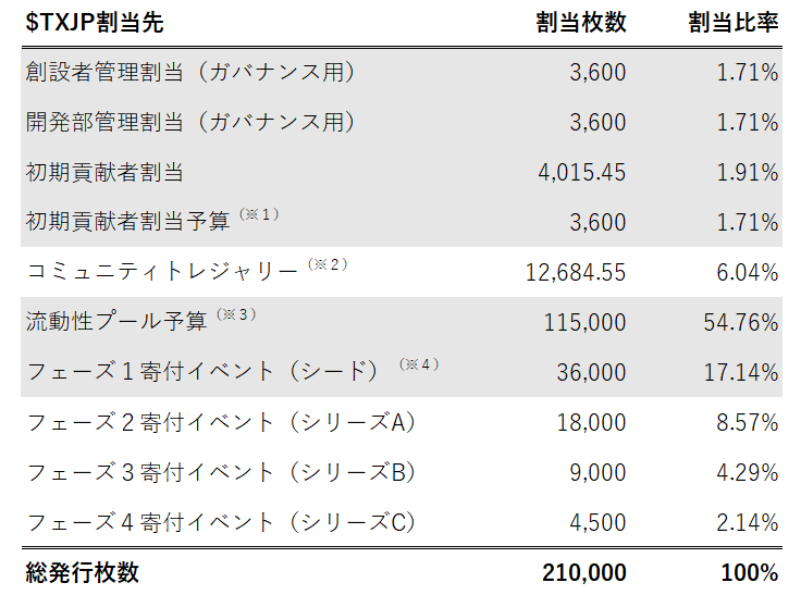 (※2)7/17 初期貢献者割当分の1,150TXJPがコミュニティトレジャリーへ移転し、コミュニティトレジャリーの割当枚数が13,834.55TXJPへ増加。