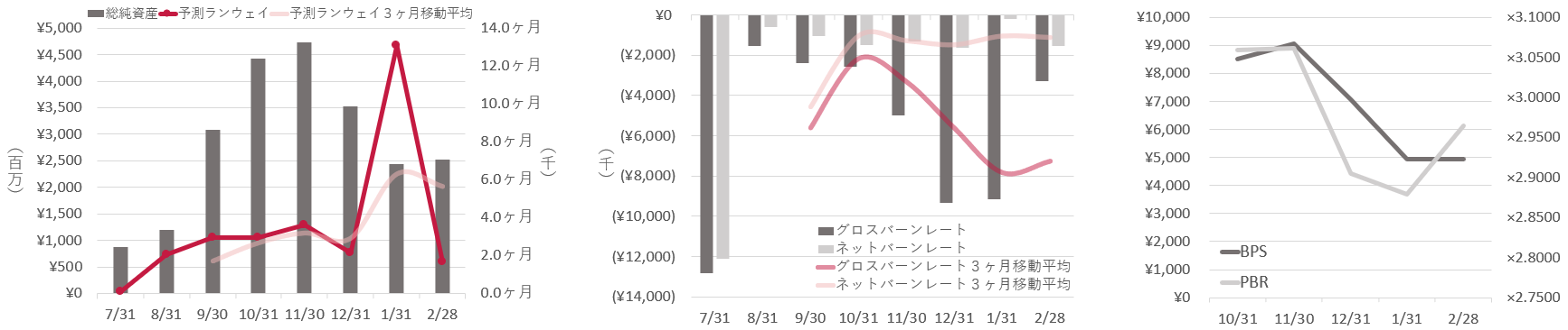 ・予測ランウェイ:総純資産/ネットバーンレートで算出。現在のキャッシュフローで純資産が何ヶ月持つかどうかを示す。