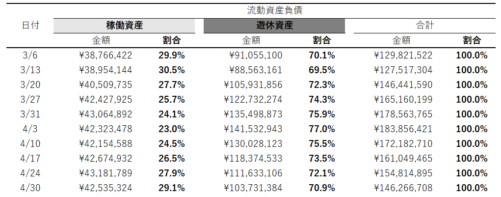 ・稼働資産:貸借対照表の流動資産にあるLPを合算し算出。