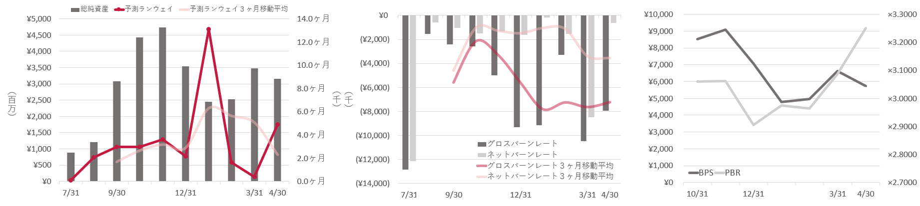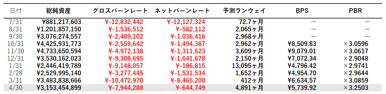 ・予測ランウェイ:総純資産/ネットバーンレートで算出。現在のキャッシュフローで純資産が何ヶ月持つかどうかを示す。